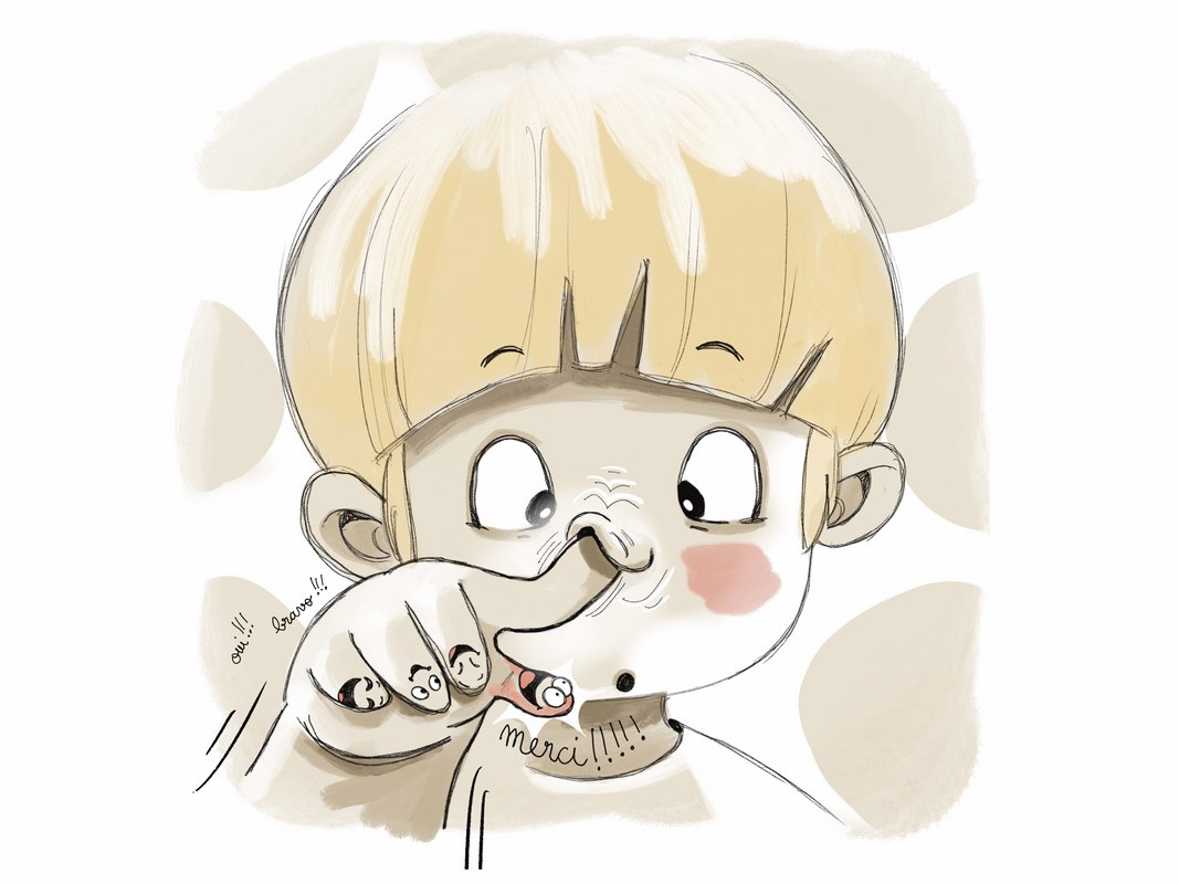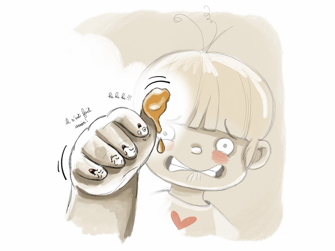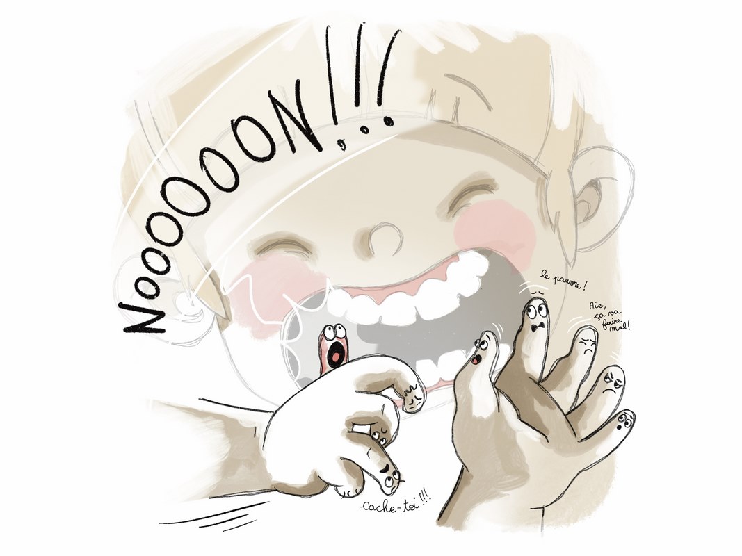 Avec l’aide de ses copains, les doigts de la main, Pouce va se venger d’être mordillé sans arrêt.